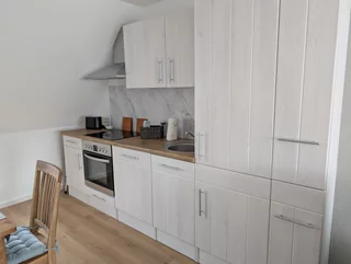 - Wohnküche (Kühl/Gefrierschrank, Herd mit Cerankochfeld und Backofen, Geschirrspülautomat, Kaffeemaschine, Wasserkocher und Toaster) und Esstischgruppe